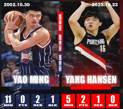 中国球员杨瀚森登场5分钟得到2分1篮板,对比姚明的首秀,杨瀚森率先打破得分荒。