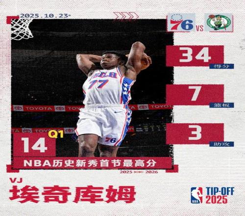 探花埃奇库姆首秀34+7闪耀成为最佳新秀热门 76人探花秀埃奇库姆领跑新秀得分榜,他目前只打了一场比赛,在揭幕战1分险胜凯尔特人的比赛,恩比德9中1梦游,但埃奇库姆站出来与马克西组成双枪闪耀。在马克西狂轰40分之外,埃奇库姆狂轰5记三分,贡献34分7篮板3助攻1抢断表现惊艳。 埃奇库姆首节14分超越詹姆斯的12分,创造NBA球员首秀首节得分纪录,且全场34分创造21世纪新秀首秀得分榜第一纪录,其余21世纪新秀首秀无人得分达到30分,2002年的吉里塞克29分位列21世纪新秀首秀得分榜第二。 埃奇库姆接下来的比赛,能否延续他首秀的表现还是未知数。不过从夏季联赛到季前赛,再到揭幕战的表现,20岁的埃奇库姆展现出少年老成的特质,成为最佳新秀的热门人选。