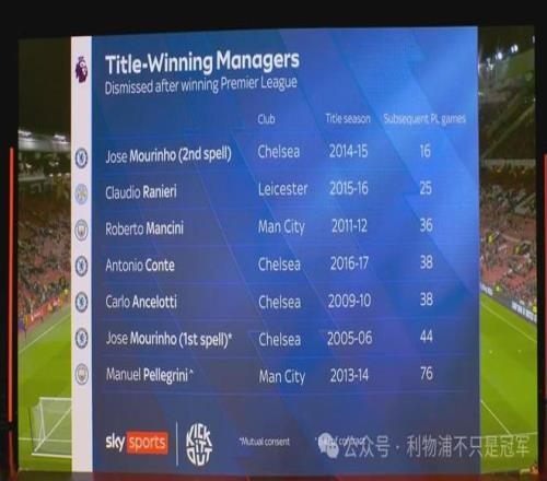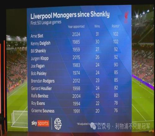 图片显示,在利物浦队史自香克利至今,尽管最近7轮输了6场,但斯洛特至今为止的前50场联赛战绩,依然与达格利什并列队史第一(102分),而胜场独居第一(31场)。 第二张图片显示,在英超历史上,率队夺冠的主帅被俱乐部提出解职,只发生在三家俱乐部——切尔西(4次)、曼城(2次)和莱斯特(1次),共计7人次。