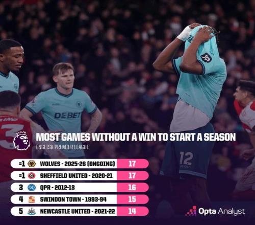 英超第17轮,狼队主场0-2不敌布伦特福德,至此,狼队本赛季前17轮比赛未尝一胜,追平英超历史开局最长不胜纪录。