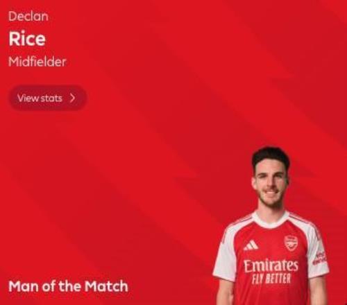 英超第17轮,阿森纳客场1-0击败埃弗顿。此役表现出色的阿森纳中场赖斯当选全场最佳球员。