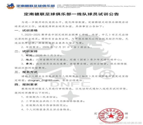 与很多球队的试训公告不同,定南赣联的此次试训,只设了年龄下限要求,即要求试训球员在2009年12月31日前出生;但并没有设年龄上限,这也就意味着包括“80后”在内的老将,都有试训机会。 当然,此番试训公告还有一点不同之处就是,要求试训球员必须具有2023-2025赛季在中国足球三级职业联赛(中超、中甲、中乙)有正式出场记录。这意味着有职业联赛出场时间,甚至经验丰富的球员,会有更大竞争优势。想必这一条会将很多球员挡在门外。 另外,和大多数俱乐部一样,定南赣联也要求试训球员需持有自由身证明,与原俱乐部无任何合同及经济纠纷。 定南赣联的前身是成立于2014年的安徽力天。2015年底,俱乐部更名为黑龙江火山鸣泉,并搬迁到哈尔滨,随后在2021年更名为黑龙江冰城。2025年1月,俱乐部远迁至江西赣州定南,更名为定南赣联,由此翻开了崭新的绿茵篇章。