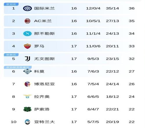 而卫冕冠军那不勒斯34分屈居第3位,罗马和尤文分别积33分和32分,排名第4和第5位,尤文则领先身后的第6名科莫队多达5分。 本赛季意甲冠军基本就将在这5队中产生。未来1场胜负,都有可能让前5名排名发生巨大变化。