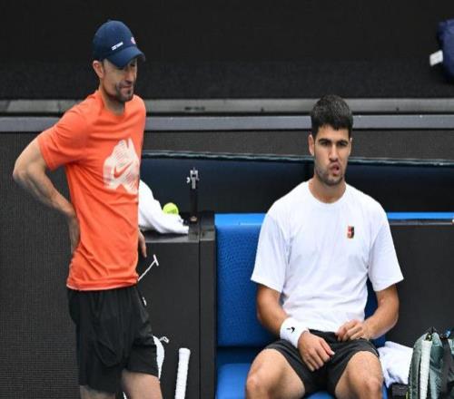 1月13日,在澳大利亚墨尔本,西班牙选手阿尔卡拉斯(右)进行赛前训练,备战澳大利亚网球公开赛。新华社发