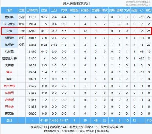 艾顿25分13板1助、东契奇25分2板7助、詹姆斯24分4板7助2帽、八村塁10分、斯玛特8分5板3助、文森特5分1板2助、海斯3分5板、蒂米3分3板2助、史密斯3分 巴恩斯22分9板3助、马穆凯拉什维利20分6板2助、英格拉姆19分6板7助3断、博伊尔斯11分7板5助3帽、奎克利9分3板7助、劳森5分1板、莫格博4分3板1助