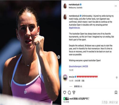 北京时间2026年1月18日,乌克兰名将科斯秋克在澳网女单首轮经历了一场三小时三十一分钟的鏖战,最终在三个抢七大战后不敌法国小将雅克莫。比赛末段,科斯秋克在一次跑动中摔倒,赛后确诊为韧带撕裂,她也因此退出了女双比赛。这位一周前刚在布里斯班站连克三位世界前十并闯入决赛的乌克兰美女,在澳网开赛第一天就遭遇了状态和命运的双重逆转。